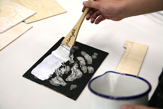 その後、明晩と膠を溶いた液体を塗ります。コレで版木を油性分に反応する性質に変えます。