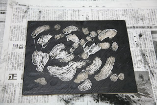 刷の時には塗ったアラビヤゴムをスポンジで拭き取り、インクをローラーで転がすと描画部分だけにインクがのります。