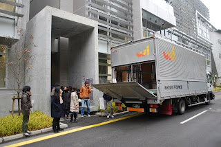 昼から荷下ろし➤梱包をとく➤展示計画に基づき配置➤