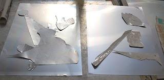 各自、作業を進めてます。↓アルミ板を切り抜きジェッソ(下地等に使うアクリル絵の具)で凹凸を作り版を制作してるところ。↓色んな版を並べて構図を決めます。↓まず版にインクを付け、余分なインクは寒冷紗(粗くて硬いガーゼのようなもの)や新聞で拭き取ります。↓プレス機に通して刷ります。刷り上がると偶然が重なり予想外のものができることもあります★