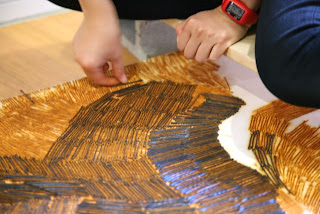 キャンバスにヘアピンを並べて水をかけ錆びさせてイメージを定着させてます。