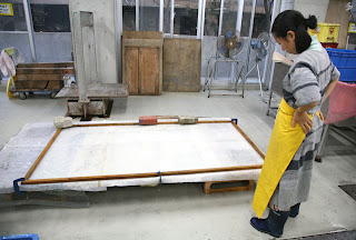 ↓大きな和紙を漉いてます。大きなものを均一な厚みに漉くのは至難の業です!これにコラグラフをする予定だそうです。