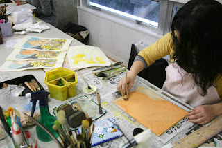 多色の場合も彫る→摺る。という作業を重ね、また彫る→色を変えてみる等の調整をしながら完成に持っていきます。