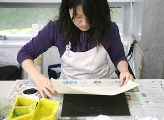 摺る前により状態の良い刷りができるよう和紙を湿らします。