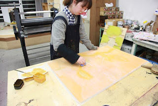 版木に直接絵の具をのせて紙に摺るのではなく、